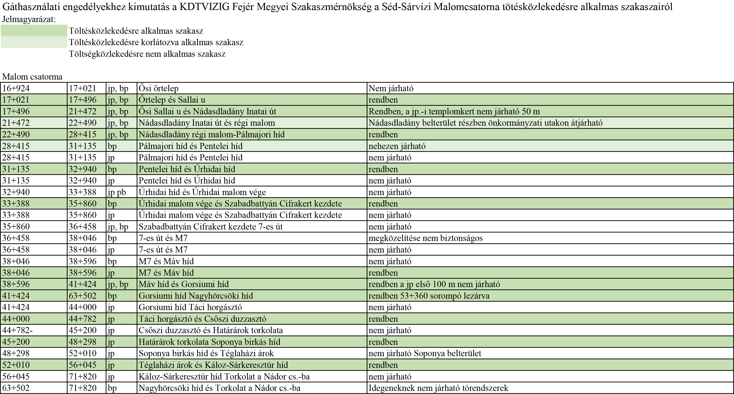 KDTVIZIG Fejér Megyei Szakaszmérnökség Séd-Sárvízi Malomcsatorna tötésközlekedésre alkalmas szakaszai