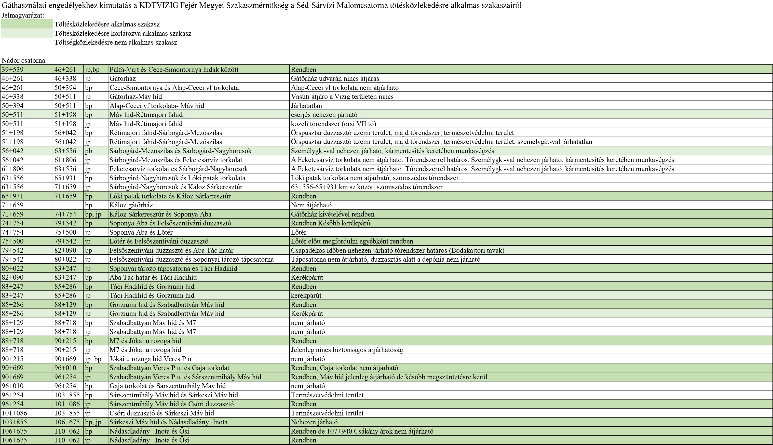 KDTVIZIG Fejér Megyei Szakaszmérnökség Nádor csatorna tötésközlekedésre alkalmas szakaszai